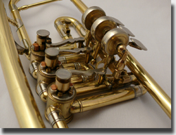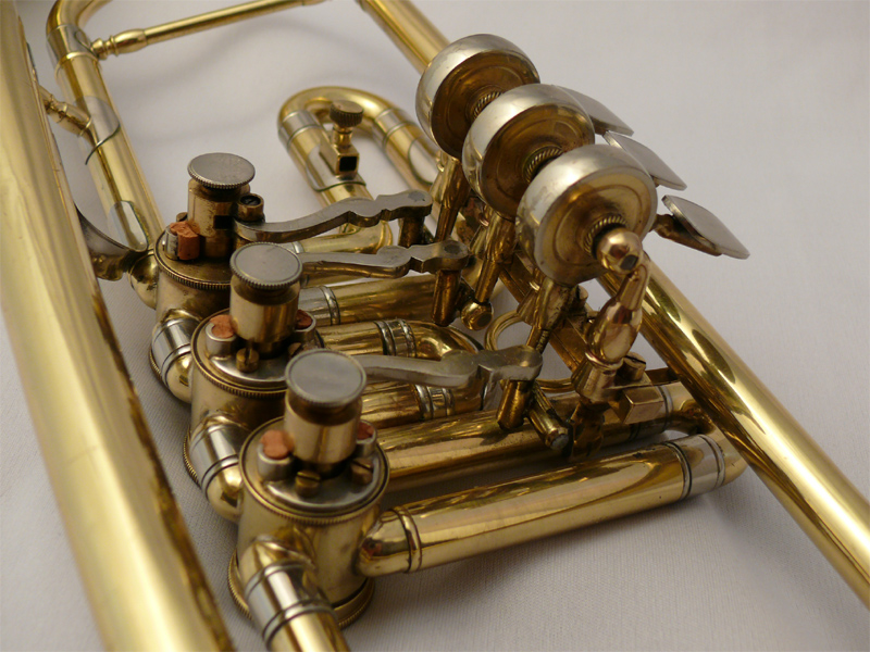 Das Bild auf der linken Seite zeigt die Ventile einer Trompete mit Drehventilen. Trompeten mit Drehventilen haben einen etwas größeren Luftwiderstand, als Trompeten mit Pumpventilen, da die Bohrungen kleiner sind und im Ventil Bögen mit 90° Winkel sind. Durch das etwas kürzere Mundrohr und den vergrößerten Schalltrichter haben sie jedoch einen weicheren Klang. |