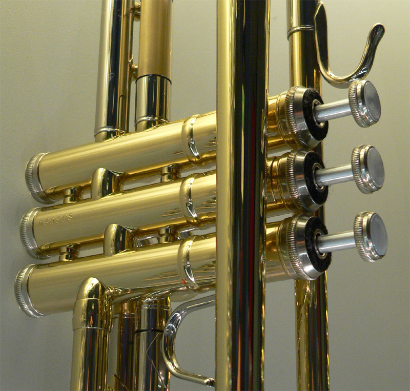 Das Bild auf der rechten Seite zeigt die Ventile einer Trompete mit Pumpventilen. Trompeten mit Pumpventilen haben meistens einen knackigeren und schärferen Ton. Dies ist zum Einen auf das längere Mundrohr zurückzuführen, als auch auf den kleineren Schalltrichter und den anderen Verlauf der Rohre.