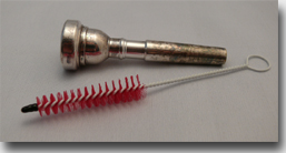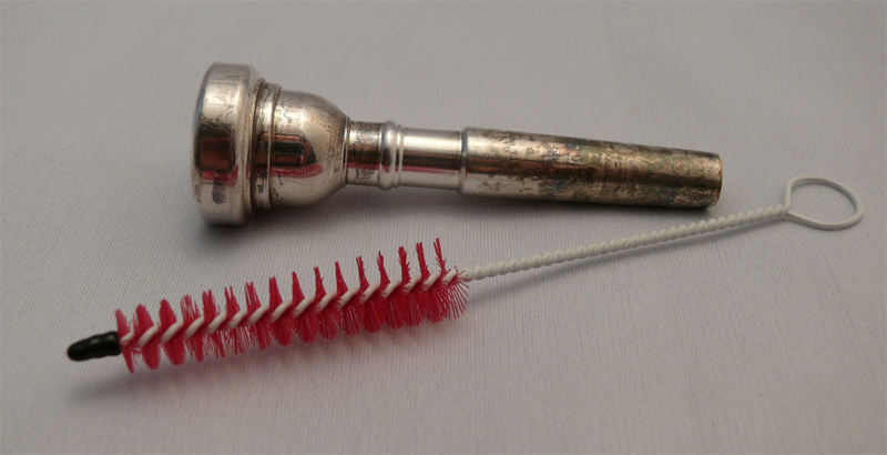Das Mundstück besteht zumeist aus massivem Messing, welches aus hygienischen Gründen versilbert wird. Wie das gute alte Tafelbesteck kann deshalb auch das Mundstück anlaufen. Sie können das angelaufene Silber mit einem herkömmlichen Silberputztuch putzen. Im Bild wurde das zur Verdeutlichung in dem mittleren Ring gemacht (in der Vergrößerung sichtbar). Im Musikfachgeschäft ist eine spezielle Mundstückbürste erhältlich, mit welcher das Mundstück auch von innen gereinigt werden kann. Das Modell im Bild hat 60 Cent gekostet, die einem die Hygiene wert sein sollte. Ich empfehle zum Aufweichen des Drecks, das Mundstück vorher in einem Topf mit Wasser kurz aufzukochen. Es wird dadurch gleichzeitig keimarmer.