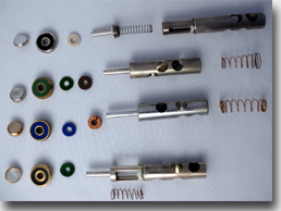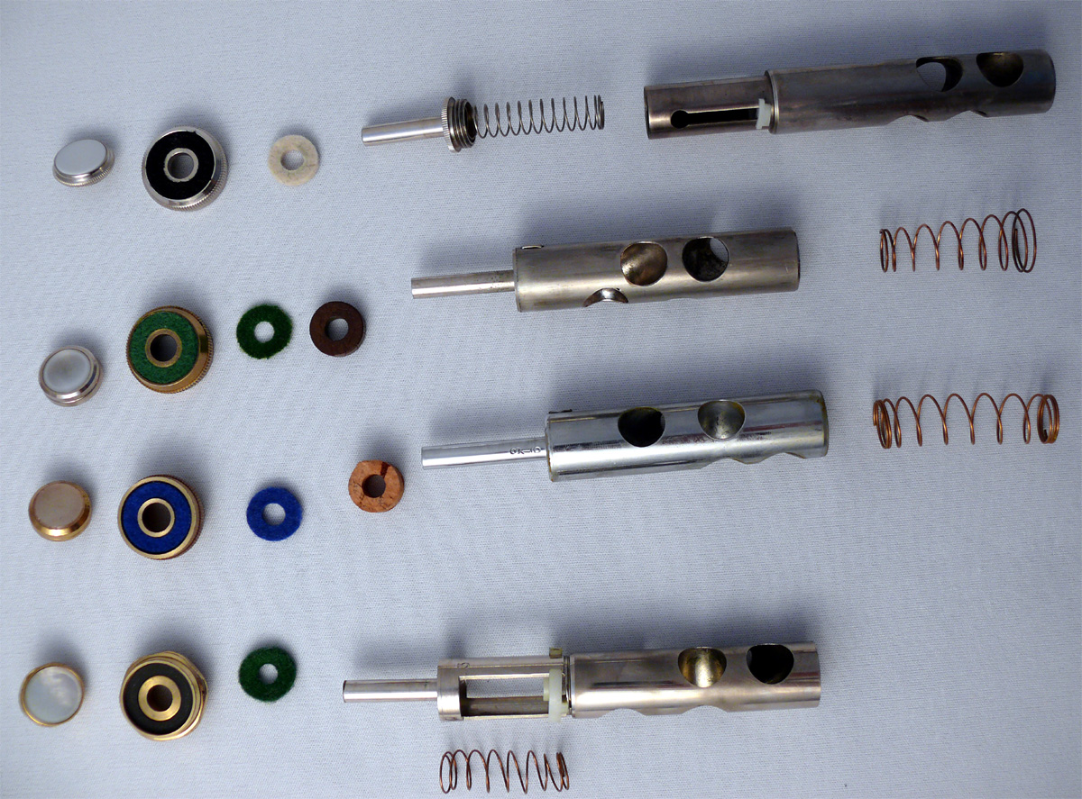 Das Bild auf der linken Seite zeigt verschiedene gängige Aufbauformen von Ventilen. Man unterscheided hauptsächlich zwischen innenliegenden Federn (Modelle ganz unten und ganz oben) und untenliegenden Federn. Wenn Sie die Schraube des oberen Ventildeckels lösen, können Sie das Ventil nach oben aus der Ventilhülse herausziehen. |