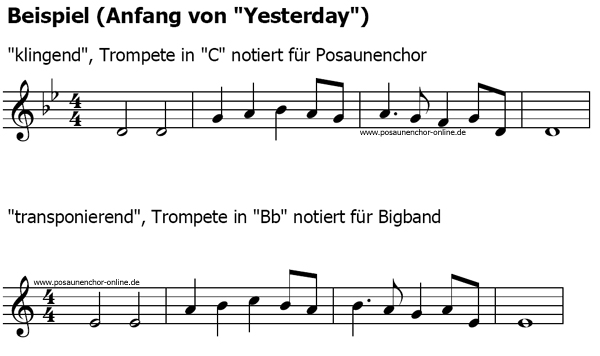 Während die Trompeten in den Posaunenchören "klingend" gespielt werden, also in "C", spielen Trompeter in Musikvereinen oder Big Bands transponierend, also in "B". Unabhängig davon spielen jedoch beide das gleiche Instrument, welches eine sogenannte (und so gestimmte) B-Trompete ist. Wenn ein Musikvereinbläser die Note "C" sieht, spielt er den Grundton seiner B-Trompete, nennt diesen Ton jedoch "C". Dieser Bläser muss also, wenn er in einem Posaunenchor mitspielen möchte, alle Noten genau einen Ton tiefer lesen (da zwischen "h" und "c" nur ein Halbton liegt, ist das "b" genau einen ganzen Ton tiefer, als das "h".